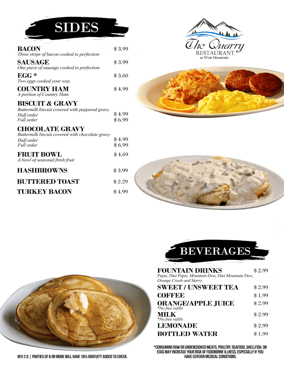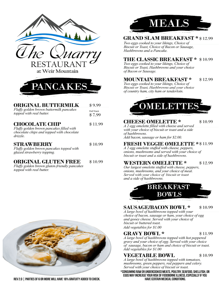 And if you visit in the morning, breakfast is an experience all its own. Pancakes come fluffy and full of flavor, from Original Buttermilk to Strawberry and Gluten-Free. The Grand Slam and Mountain Breakfast meals bring hearty energy to start the day right, while omelettes and breakfast bowls - from the Western to the Sausage/Bacon Bowl - round out a menu that’s as versatile as it is comforting. Altogether, The Quarry At Weir Mountain Menu delivers a genuine taste of Tennessee hospitality - generous, flavorful, and always welcoming.