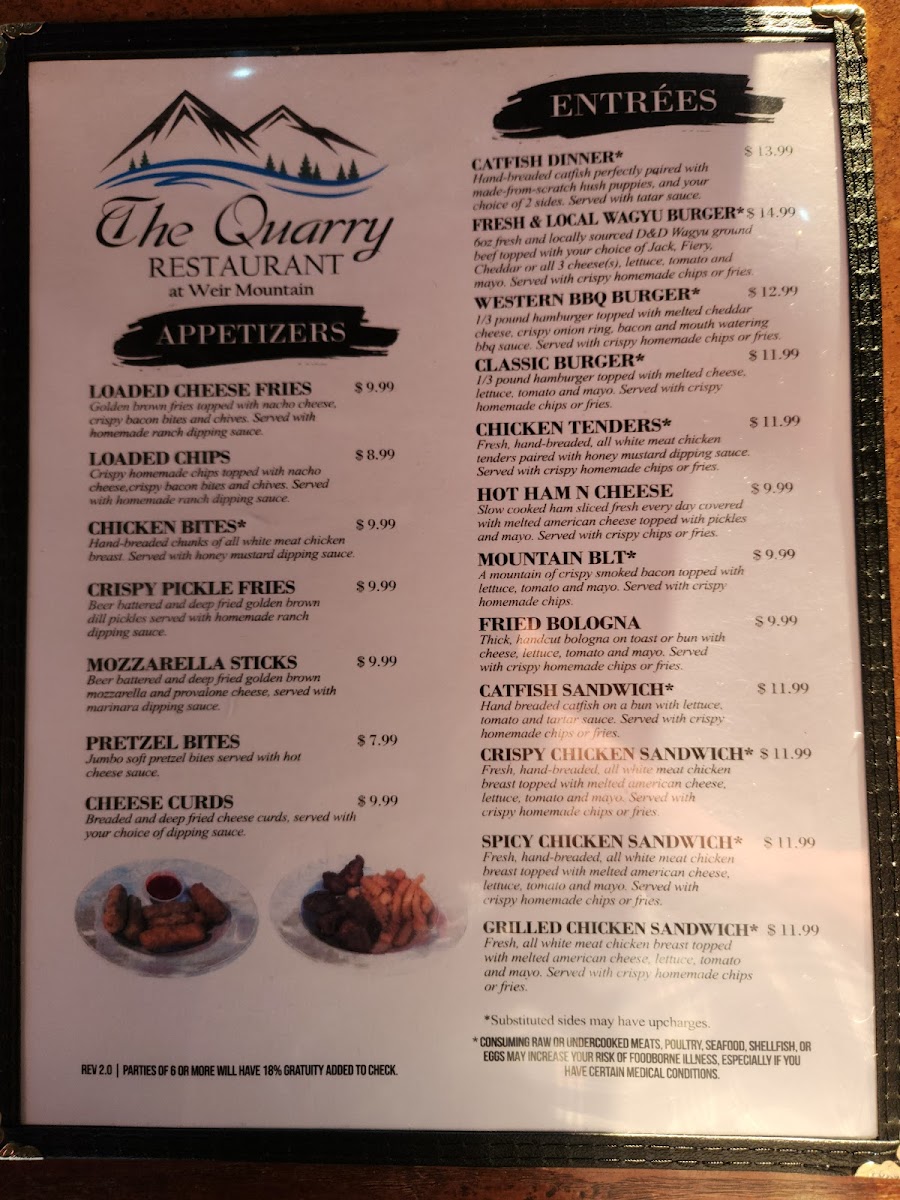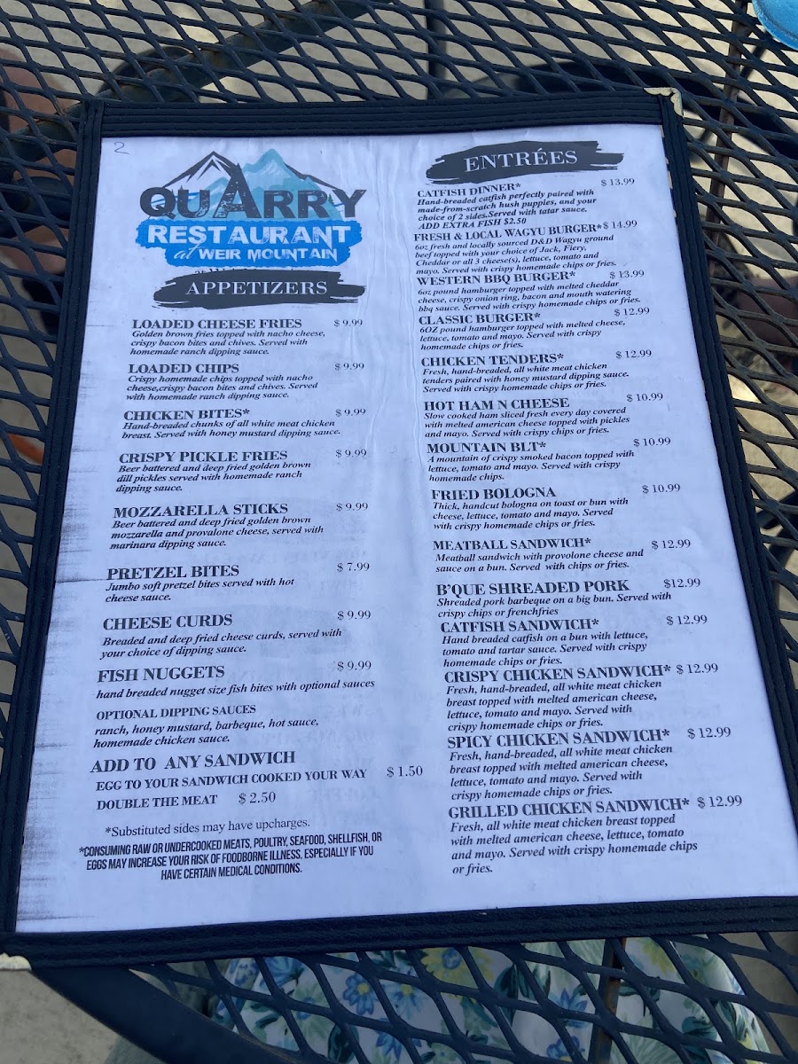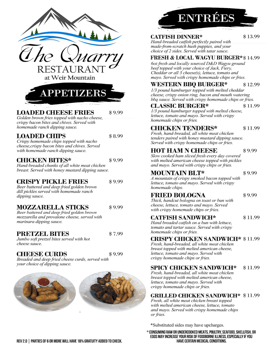 The Quarry At Weir Mountain Menu captures the spirit of Southern comfort dining with a warm, homey touch that instantly makes guests feel welcome. Whether you’re visiting for a hearty breakfast or a satisfying dinner, every item feels thoughtfully crafted to bring flavor, freshness, and nostalgia together. The appetizers set the tone perfectly - the Loaded Cheese Fries and Crispy Pickle Fries come out golden and tempting, while the Chicken Bites and Pretzel Bites make ideal sharables, each with that irresistible balance of crunch and seasoning. These starters prepare you for what’s to come: generous portions and authentic comfort food done right.